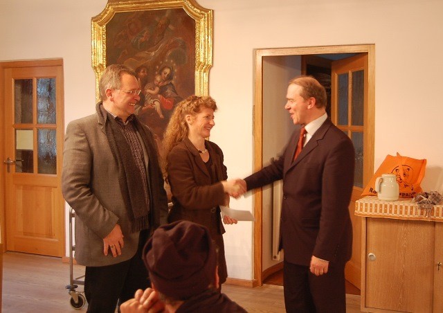 Bei der Weihnachtsfeier der Wohnungslosen im Pfarrheim St. Jodok konnten Ulf-Arne von Trotha (v.l.) und Anke Humpeneder-Graf von der Bürgerstiftung Landshut eine Spende an Caritasleiter Josef Stangl übergeben. Die 500 Euro aus dem Erlös des Stifterdinners sollen mit dazu verwendet werden, das sog. „Ebersberger Modell“ zur Vermeidung von Obdachlosigkeit in Landshut voranzutreiben. Langfristig, so Stangl, sollen durch Prävention die Kosten für die Unterbringung gesenkt werden. Im vergangenen Jahr waren in Landshut 307 Menschen ohne Wohnung, darunter 41 Kinder unter 7 Jahren.